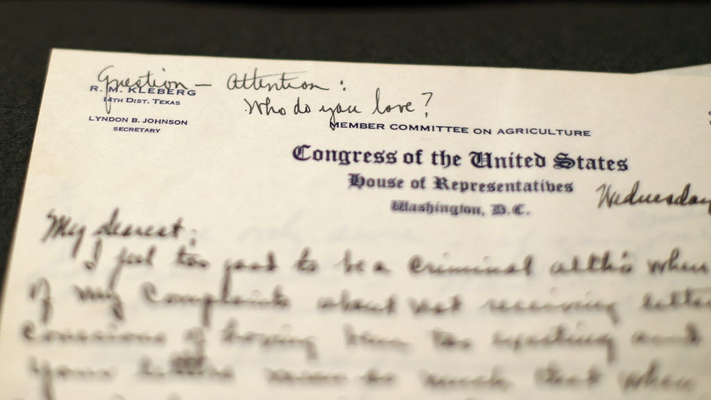 A love letter sent by Lyndon Johnson, then a 26-year-old congressional aide, to Claudia Alta “Lady Bird” Taylor, then 21, is seen at the LBJ Presidential Library at the University of Texas today in Austin, Texas. For the first time, the entire collection of nearly 100 love letters written between Lyndon Johnson and Lady Bird Johnson during their 21/2-month courtship in 1934 is being made available to the public, beginning on Valentine’s Day. (AP Photo/Eric Gay)