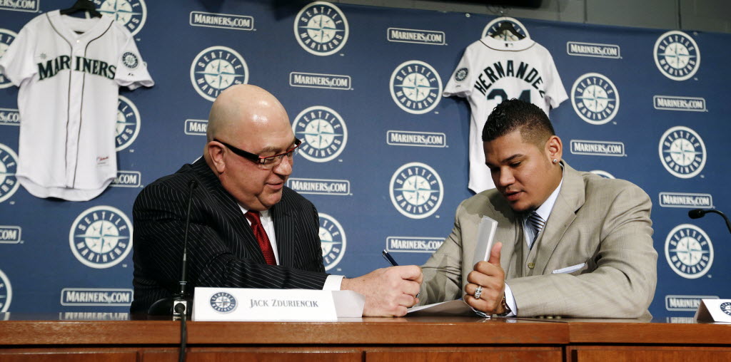 Seattle Mariners’ Felix Hernandez, right, signs an agreement in his new contract with general manager Jack Zduriencik to start a news conference today in Seattle. Hernandez signed a seven-year contract with the Mariners that makes him the highest-paid pitcher in baseball. The new deal will be worth $175 million. Seattle Times story here. (AP Photo/Elaine Thompson)