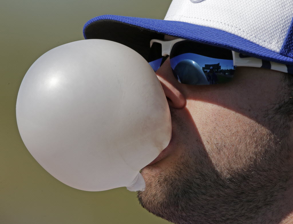 Kansas City Royals third baseman Mike Moustakas blows a chewing gum bubble during a spring training baseball workout on Friday in Surprise, Ariz. (AP Photo/Charlie Riedel)