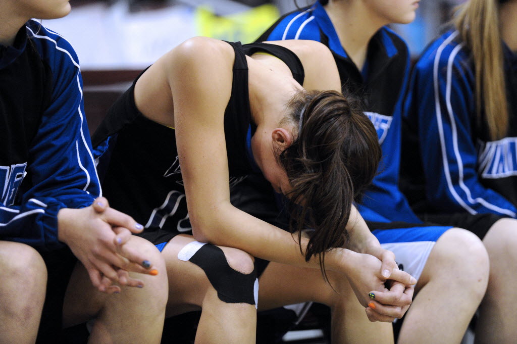 Coeur d’Alene’s Brittany Tackett (14) reacts during the final moments of the girls Class 5A State Championship high school basketball game against Post Falls on Saturday in Nampa. Post Falls won 46-44. (AP Photo/Robby Milo)