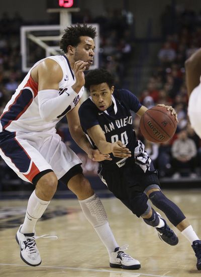 San Diego’s Christopher Anderson (00) attempts to drive against Gonzaga’s Elias Harris during the first half of an NCAA college basketball game in Spokane, Wash., on Saturday. Gonzaga defeated San Diego 81-50. Game story and boxscore here. (AP Photo/Young Kwak)