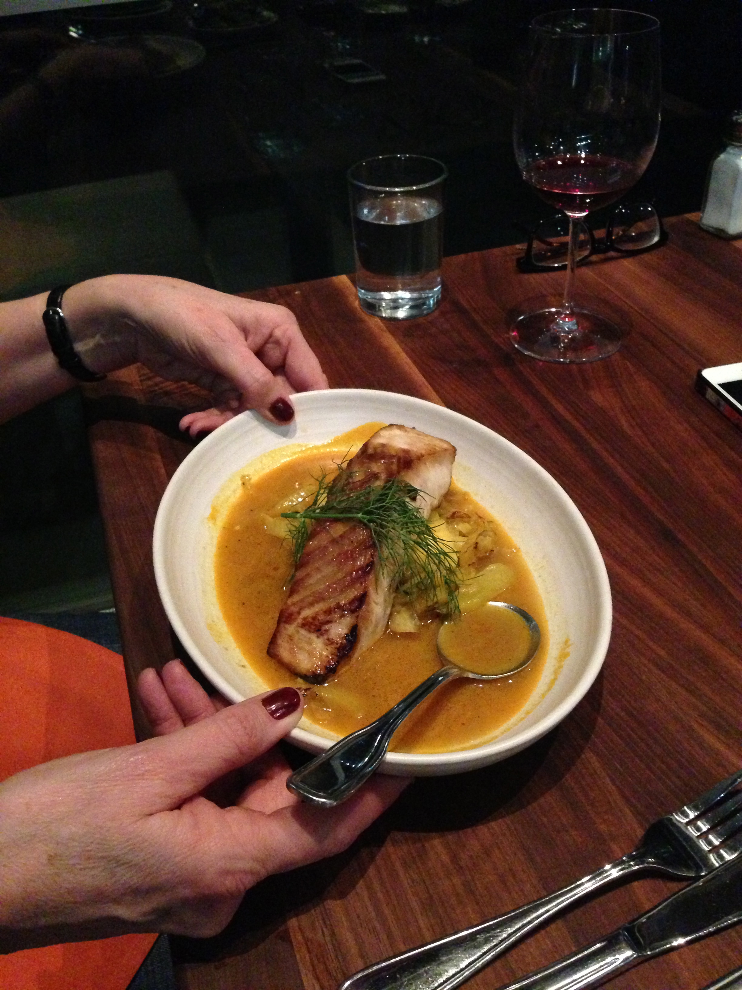 My wife took advantage, which meant that for $28 (her wine was extra) she got a plate of Thai beef carpaccio (tasty raw beef with marinade on arugula), Idaho sturgeon with braised fennel and tomato-saffron consomme and, for dessert, curry chocolate cake with pumpkin ice cream. Mike ordered a chicken bibb-lettuce salad and an entree of mushroom risotto. I, on the other hand, had eaten earlier and so opted for only a couple of appetizers — a kale salad and roasted brussells sprouts.