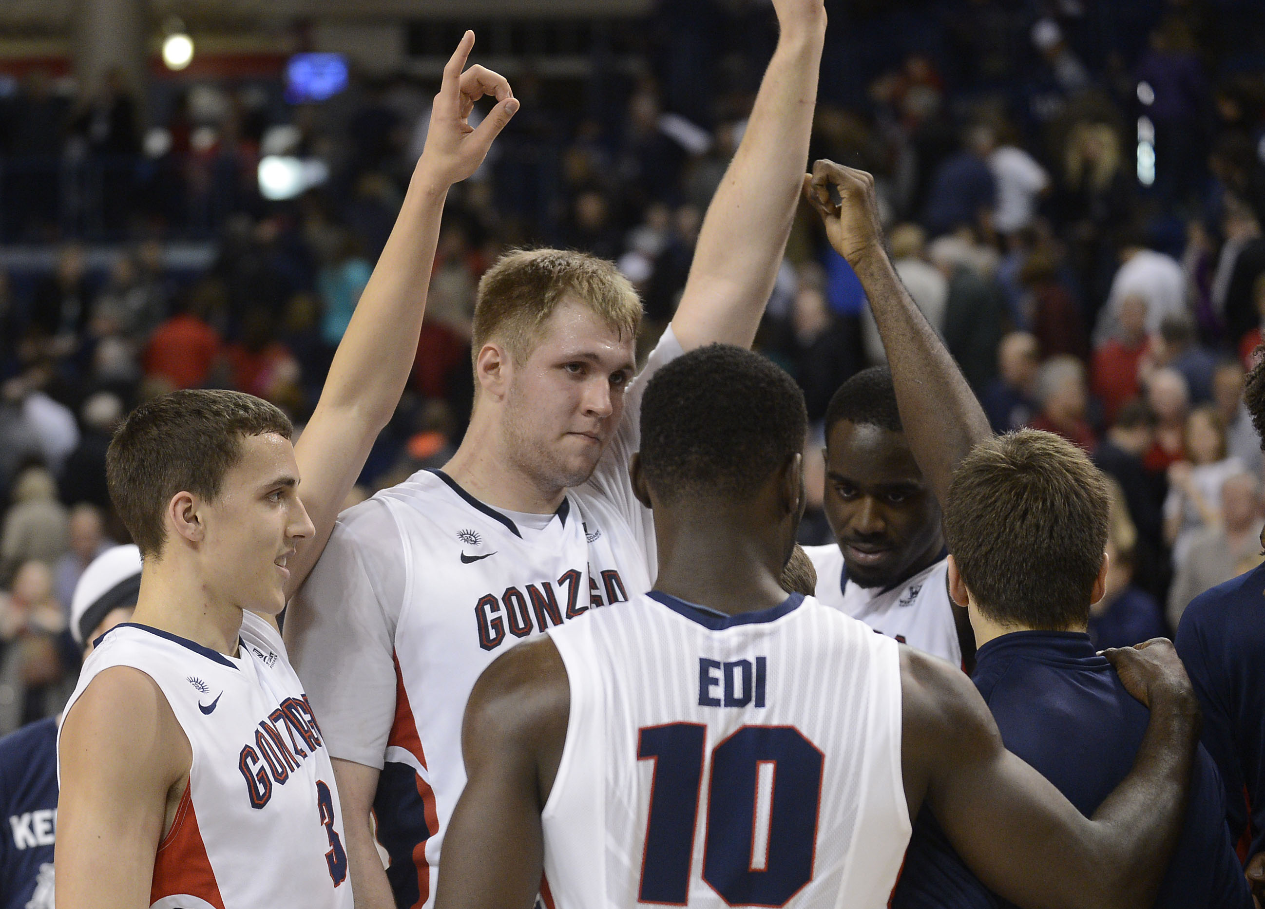 Gonzaga players celebrate Saturday’s 81-50 victory over San Diego.