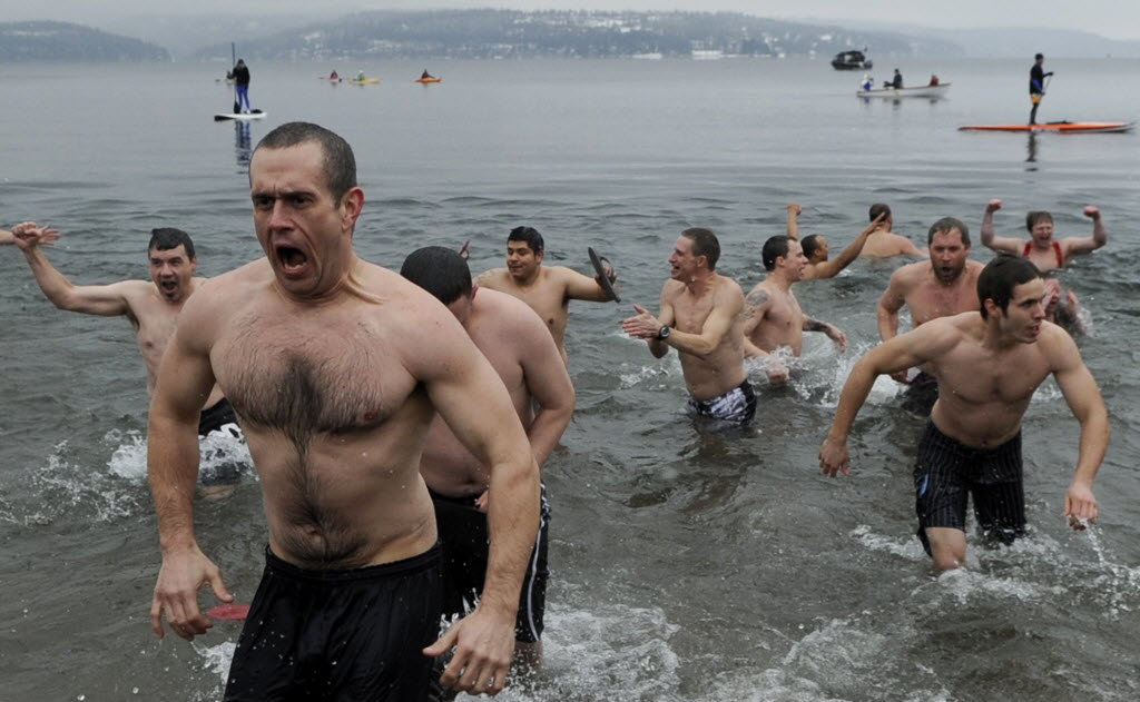 Plungers dash out of the chilly waters of Lake Coeur d’Alene Tuesday during the annual Polar Bear Plunge at Sanders Beach. The informally organized event started with a few friends making the jump to more than 1000 people crowding the beach to swim or to watch. (SR photo: Kathy Plonka)