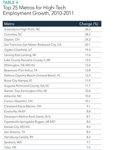 The key takeaways: high-tech jobs tend to be concentrated in well-known tech hubs… High-tech employment growth, on the other hand, is happening in a more geographically and economically diverse set of regions. Growth is occurring in the Rust Belt and the South, as well as along the coasts and in regions with many high-skilled workers.