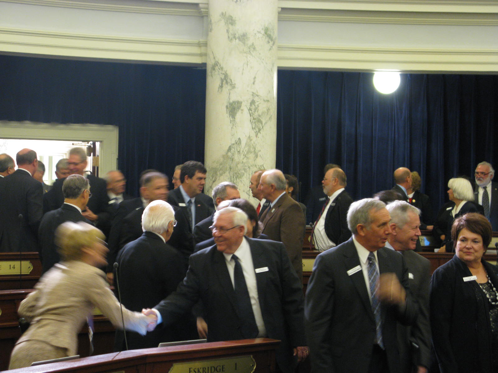 The House and Senate have now convened, in advance of Gov. Butch Otter’s annual “State of the State” and budget message to a joint session of the Legislature, which will occur in the House chambers. The governor’s speech, laying out his agenda for the legislative session that starts today, is scheduled for 1 p.m. Mountain time (noon Pacific). Here, senators file into the House chamber for the joint session.