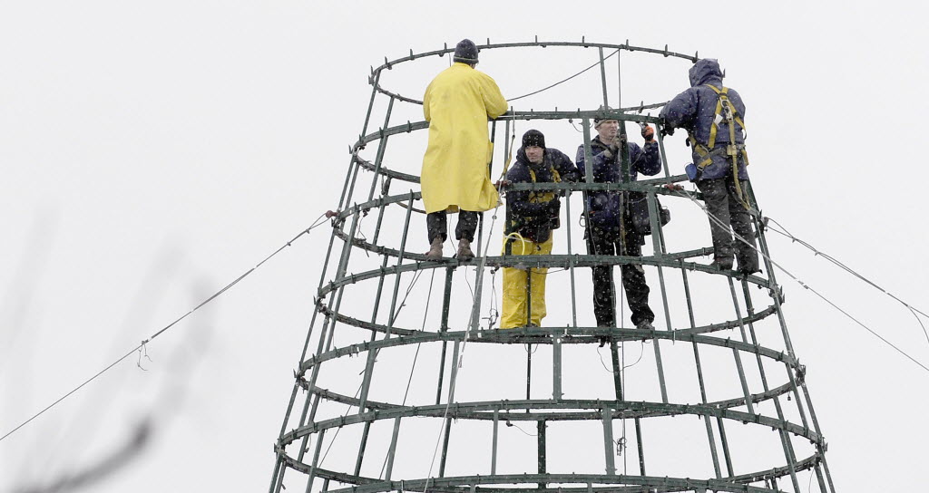 Hagadone Hospitality workers brave the wintry weather to dismantle the Christmas tree on top of the offices in Coeur d’Alene on Tuesday. (AP Photo/The Spokesman-Review, Kathy Plonka)