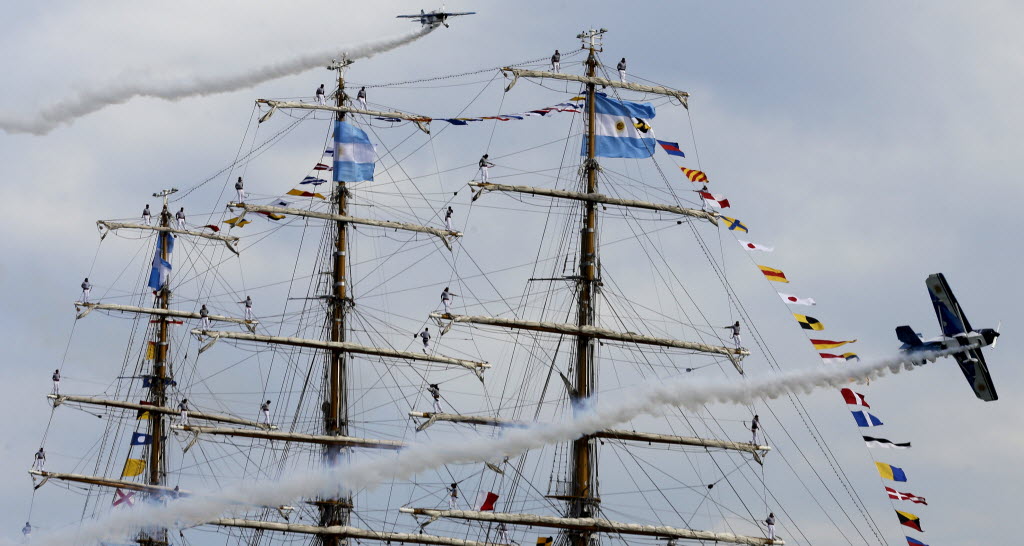 Sailors stand on the yardams of Argentina’s naval training tall ship ARA Libertad as planes fly past during a welcoming ceremony at the port of Mar del Plata, Argentina, today. The Argentine naval ship detained for more than two months in Ghana because of a financial dispute returned home to a triumphant welcome. Ghana courts ordered the ship held in October on a claim by Cayman Islands-based hedge fund NML Capital Ltd. But the U.N.’s International Tribunal for the Law of the Sea ordered the ship’s release last month after Argentina argued that warships are immune from seizure. (AP Photo/Natacha Pisarenko)