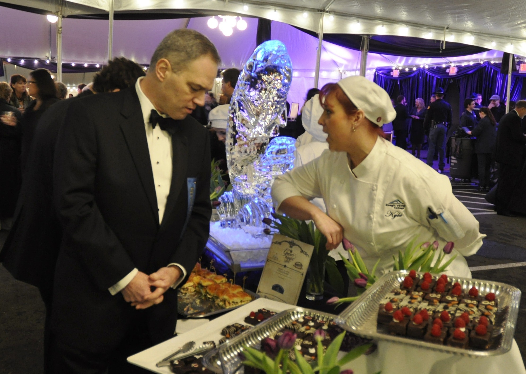 OLYMPIA — At a table adorned with an ice sculpture of a salmon, State Rep. Ross Hunter gets advice on an appetizer selection from Kyla Applegate of Skagit Valley College.