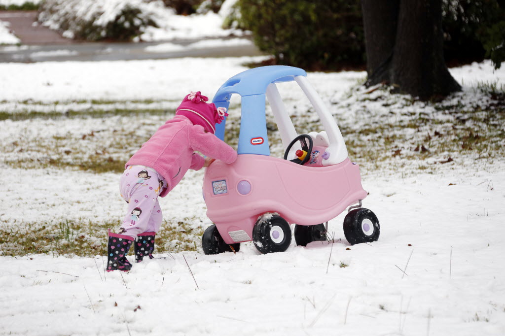Molly Cleland, two and a half, pushes her car through the snow in Jackson, Miss., Thursday. A winter storm system left 2 to 4 inches of snow in parts of central Mississippi before heading east toward Alabama, the National Weather Service said. (AP Photo/Rogelio V. Solis)