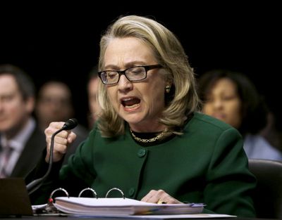 Secretary of State Hillary Rodham Clinton pounds her fist as she testifies on Capitol Hill in Washington, Wednesday, before the Senate Foreign Relations Committee hearing on the deadly September attack on the U.S. diplomatic mission in Benghazi, Libya, that killed Ambassador Chris Stevens and three other Americans. (AP Photo/Pablo Martinez Monsivais)