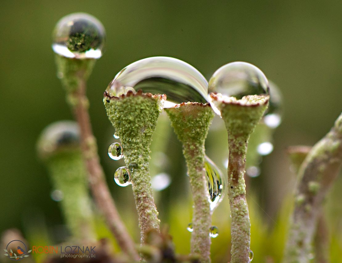 Raindrops cling to moss and lichen growing on a fencepost along a field this morning.”