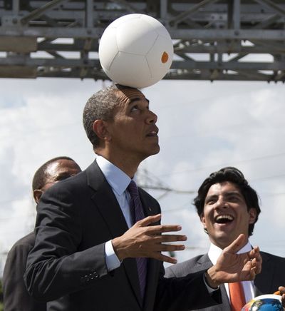 U.S. President Barack Obama demonstrates “the Soccket Ball,” which uses kinetic energy to provide power to charge a cell phone or power a light, during an event at the Ubungo power plant to promote energy innovation earlier today in Dar Es Salaam, Tanzania. The president is traveling in Tanzania on the final leg of his three-country tour in Africa. You write the cutline. (AP Photo/Evan Vucci)