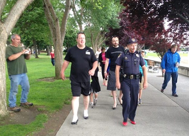 Coeur d’Alene Police Chief Wayne Longo and Director Tom Carter of the Human Rights Education Institute wore high heels and participated in the “Walk a Mile in her Shoes” event on Saturday in the City Park. This is an annual event that brings awareness to stopping domestic violence. Both men chose to wear socks with their heels. Kind of a fashion no-no. But their support and participation of this worthy event is commendable. (Photo: Coeur d’Alene Police Department photo)