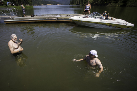 Franco Barnhart, left, visits with his business partner Tony Russo as they take a dip Monday near the boat launch of Fernan Lake. The Panhandle Health District and the Idaho Department of Environmental Quality issued a warning of high levels of blue-green algae in the lake that may be harmful. Story here . (Coeur d’Alene Press photo: Shawn Gust)