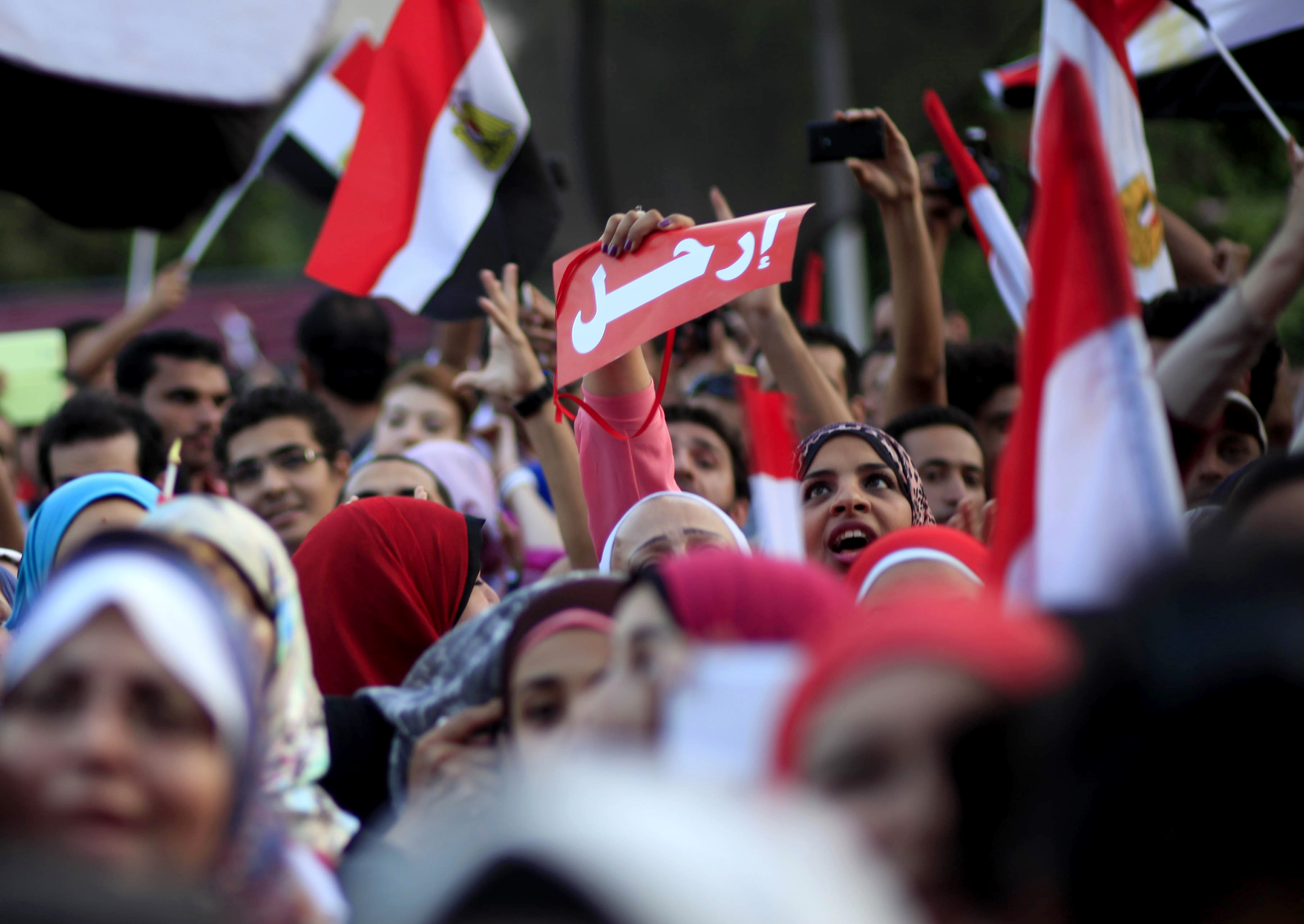 An opponent of Egypt’s Islamist President Mohammed Morsi holds a poster with Arabic that reads, “leave,” outside of the presidential palace, in Cairo, Egypt, Wednesday, July 3, 2013.