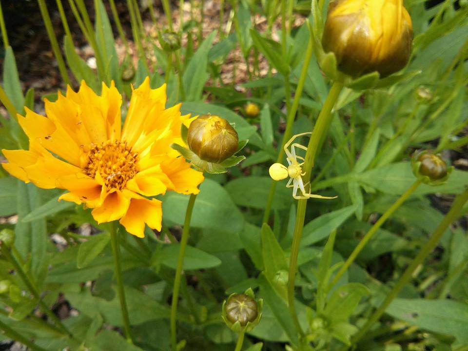 Sam Crawford posted this pic on Facebook of a spider enjoying his wife’s flowers. He says he thinks it’s crab spider which can change color to match the flowers it hunts on.