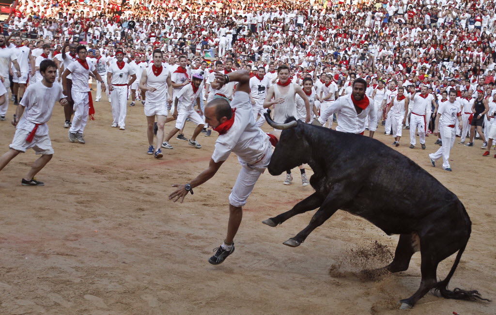 A reveler is pushed by a Torrestrella ranch bull at the bull ring at the end of the fifth running of the bulls, at the San Fermin fiestas, in Pamplona northern Spain earlier today. (AP Photo/Alvaro Barrientos)