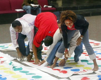 Jacob Jenkins; Ramone Robinson; Nelson Miller and Tairisha Sawyer play Twister in Edwardsville, Ill. Charles “Chuck” Foley, inventor of the iconic Twister game that launched decades of awkward social interactions at parties, died today at a care facility in St. Louis Park, Minn, according to his son, Mark Foley. He was 82. Story here. (AP Photo/St. Louis Post-Dispatch, Wayne Crosslin, File)
