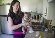 (Colin Mulvany SR photo: Amber Williams, with her daughter, Isabelle, prepares her breast milk to be stored in the freezer for later feedings)