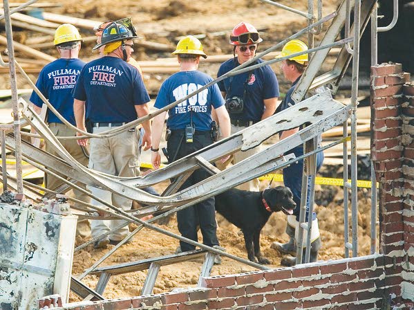 Assistant Fire Marshall Rick Freier, right, and accelerant-detection dog Mako from the Spokane Valley Fire Department help with an investigation Tuesday at The Grove apartments in Pullman. Moscow-Pullman Daily News story here . Also: SR story from Tuesday here. (M-P Daily News photo: Geoff Crimmins)