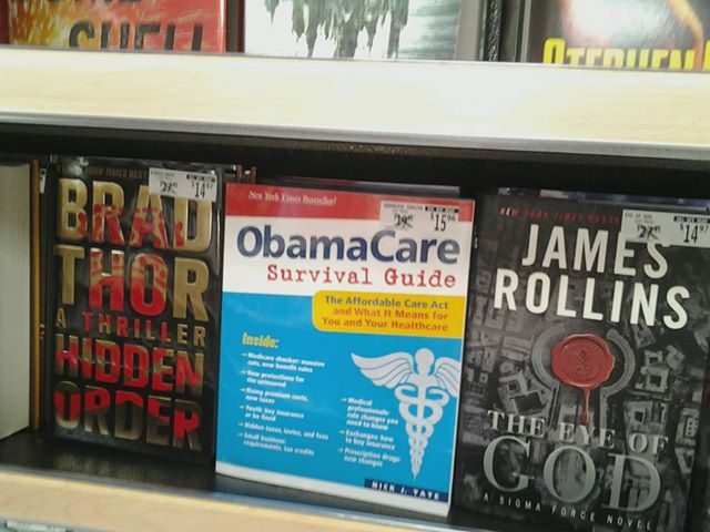 Leslie, a long-time friend of mine, got such a chuckle out of the “ObamaCare Survival Guide” that she saw at the Hayden WalMart book section, among the fictional titles, that she bought it — and posted the photo of her Facebook Page. Where I saw it.