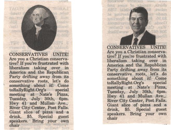 As I mentioned to you before, Rally Right is attempting to re-energize by scheduling a meeting at 6 p.m. Tuesday, July 30, at Nate’s Pizza, H41 & Mullan, Post Falls. For $5, you get a large piece of pizza and a drink — and all the heated rhetoric you can take. The pizza should be good. No guarantee on the rest. The photo above was taken of ads produced in this week’s Nickel’s Worth.