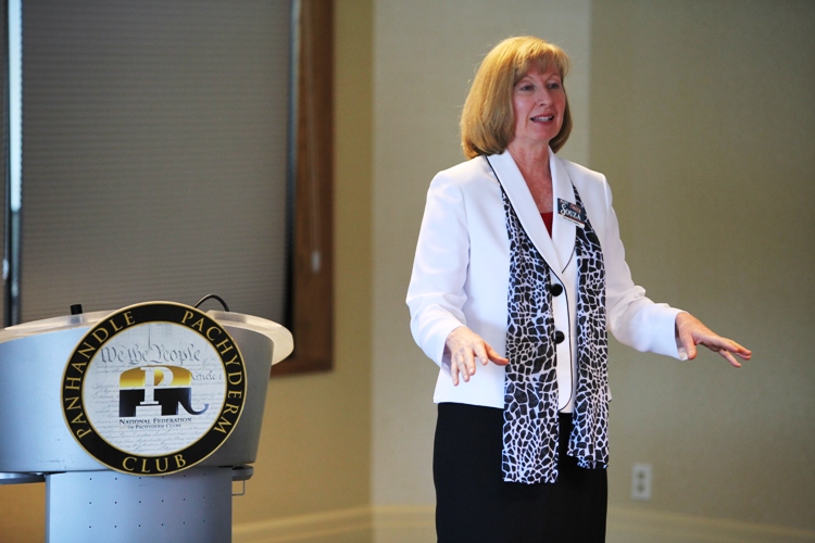 Coeur d’Alene mayoral candidate Mary Souza speaks to the Panhandle Pachyderm Club at Templins ersort in Post Falls during the lunch hour. Photographer Duane Rasmussen tells Huckleberries: “One matter she discussed was the city of Coeur d’Alene’s practice of paying for research and then not allowing copies to be made of the conclusions. One, read-only document was retained. Souza promised there would be transparency when she became mayor.”