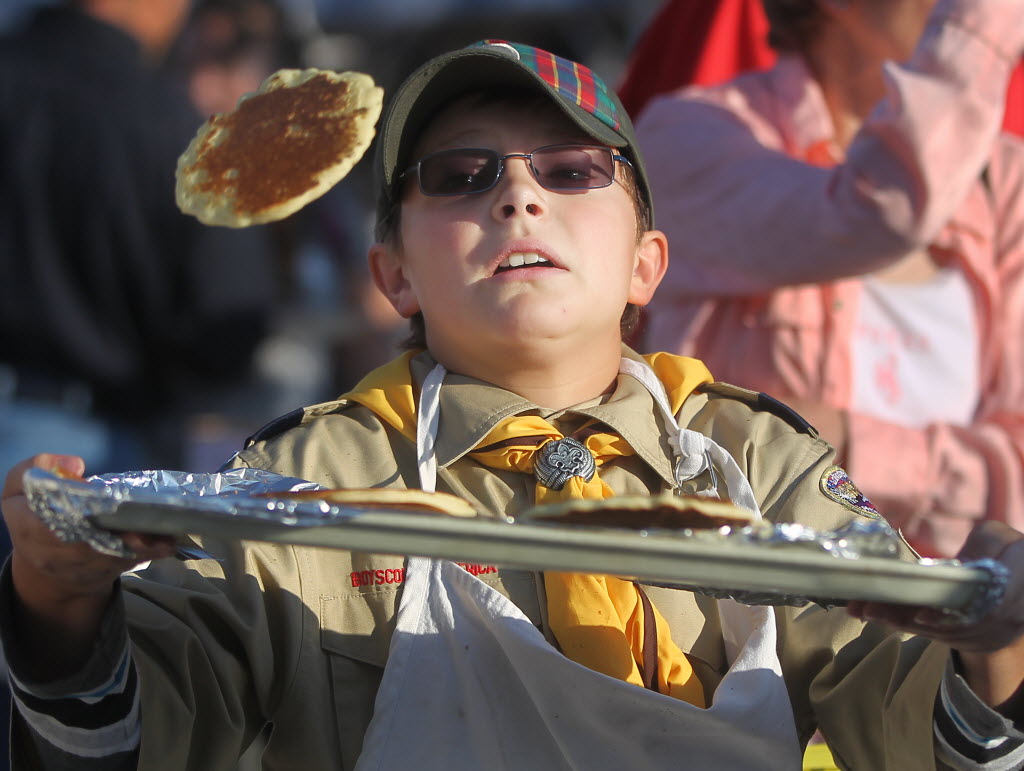 Ryan Williams, 11, goes to catch a pancake to serve during the annual Cheyenne Frontier Days free pancake breakfast sponsored by the Kiwanis Club of Cheyenne at the Cheyenne Depot Plaza this morning. You write the cutline. (AP Photo/The Wyoming Tribune Eagle, Blaine McCartney)