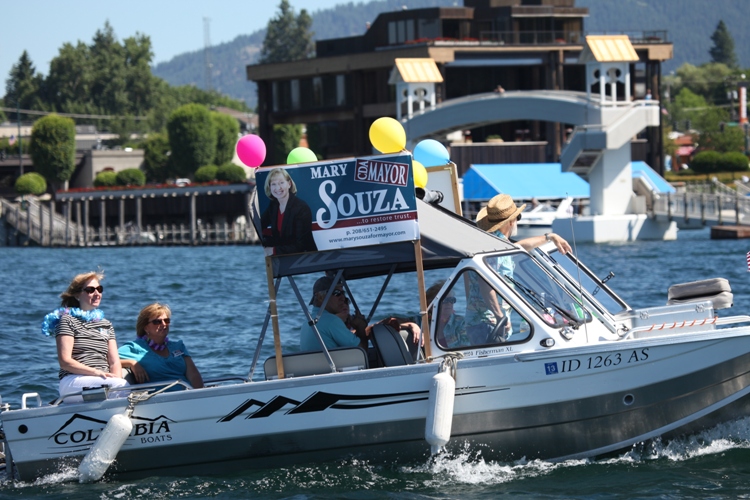 Coeur d’Alene mayoral candidate Mary Souza (back of boat piloted by Ron Dayton) took her campaign to the waters of Lake Coeur d’Alene Sunday — and photographer Duane Rasmusson was their to capture the moment.