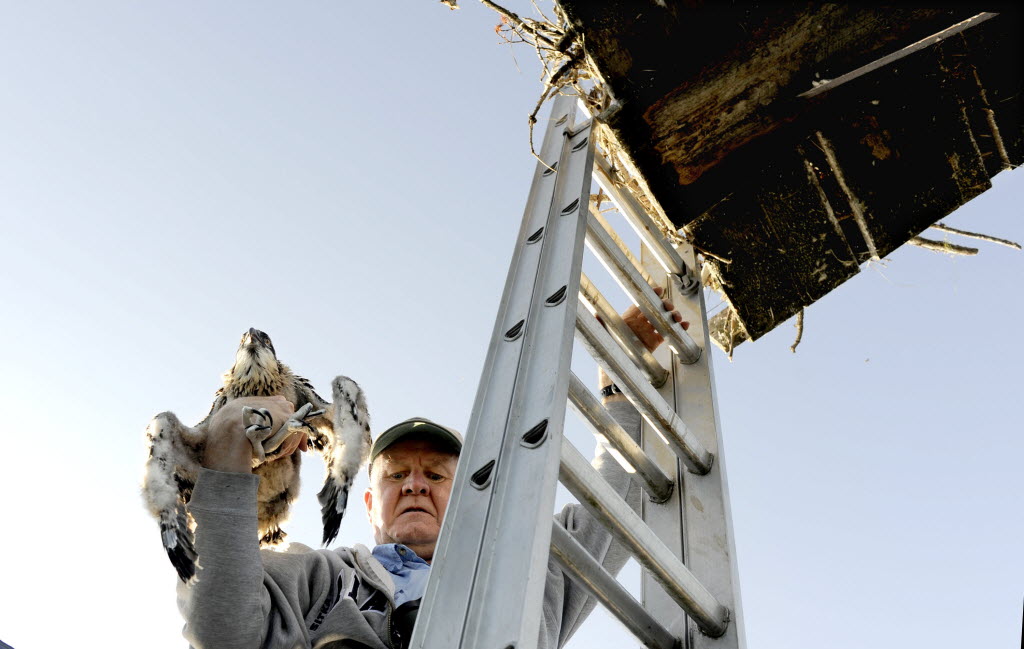 Dr. Wayne Melquist,PhD removes a juvenile opsrey form a nest on Lake Coeur d’Alene on Saturday, July 13. He was banding nestlings as part of a long-running research on the population of osprey. North Idaho has the largest nesting population of osprey in the Western U.S. Becky Kramer story here . (SR photo: Kathy Plonka)