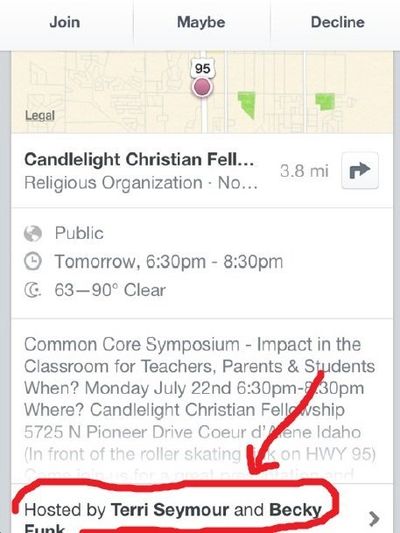 Confusion re: whether Trustee Terri Seymour “hosted” the anti-Common Core discussion at Candlelight Church Fellowship last night stems from this Facebook invitation that went viral locally after it was circulated to friends of the two women.