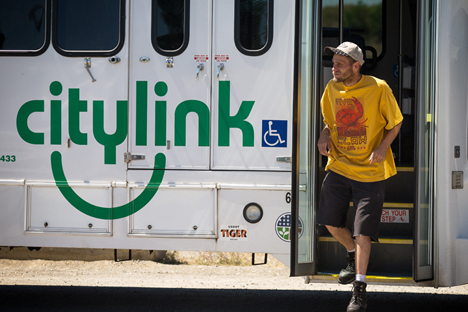 Martin Burke, of Coeur d’Alene steps off a Citylink bus Monday as it drops off passengers at the transit center in Riverstone. (Coeur d’Alene Press photo: Shawn Gust)