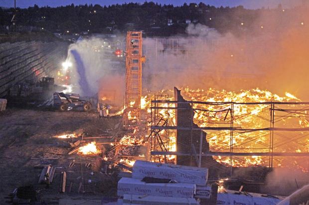 Firefighters work to contain a fire at the unoccupied Grove apartments complex in Pullman on July 14. Firefighters responded to the blaze that took almost two hours to contain. The apartment complex was about two weeks from completion. Bryan Kitchen, 31, who is suspected of starting the fire, told police that he was drunk and a voice told him to start the fire. Story here. (AP photo)