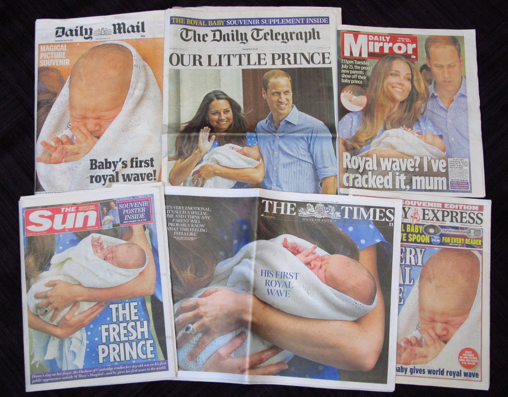 A selection of British daily newspapers on Wednesday headlining the news of the birth of a son to Prince William and Kate, the Duke and Duchess of Cambridge. It was announced on Monday that Prince William’s wife Kate has given birth to a baby boy. The baby was born at 4:24 p.m. and weighed 8 pounds 6 ounces. The infant will become third in line for the British throne after Prince Charles and William. (AP Photo/Tony Hicks)