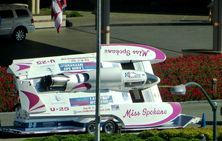 Pointing to the return of hydroplane races, off Silver Beach, east of Coeur d’Alene planned for Labor Day weekend, Miss Spokane was displayed in front of the Coeur d’Alene Resort Tuesday. (Photo: Don Sausser)