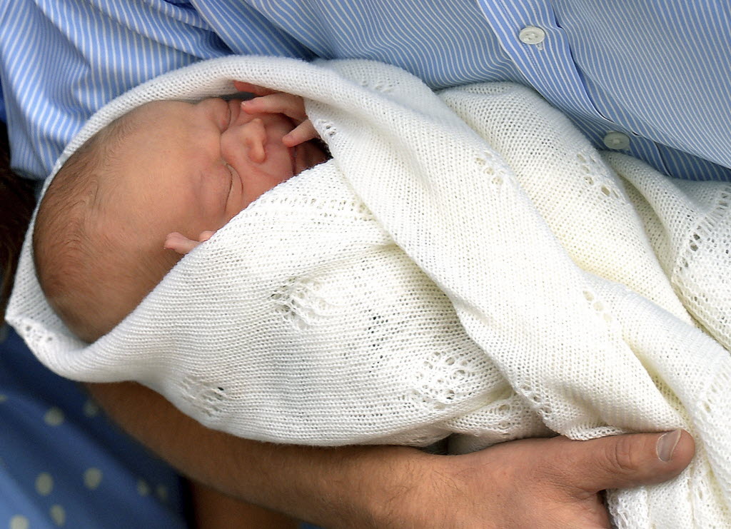 Britain’s Prince William carries his new born son, the Prince of Cambridge, who was born on Monday, into public view for the first time, outside the Lindo Wing of St. Mary’s Hospital, in London. Royal officials say Britain’s new prince has been named George Alexander Louis. Palace officials said Wednesday that the 2-day-old baby and third-in-line to the throne will be known as His Royal Highness Prince George of Cambridge. (AP Photo/John Stillwell, Pool, File)