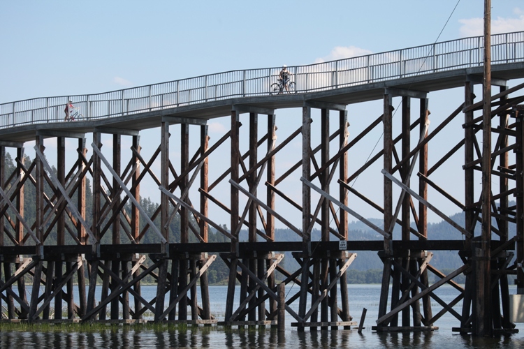 Duane Rasmussen photographed bicyclists on the old railroad bridge that goes across Coeur d’Alene Lake at the south end of the lake at the entry to the St. Joe River, along the Trail of the Coeur d’Alenes.