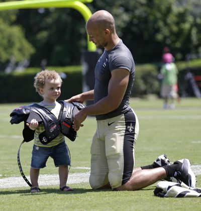 New Orleans Saints defensive back Chris Carr (40) puts his shoulder pads on his son, 21-month-old Octavian Carr, after their NFL football training camp in Metairie, La., Monday. You write the cutline. (AP Photo/Gerald Herbert)