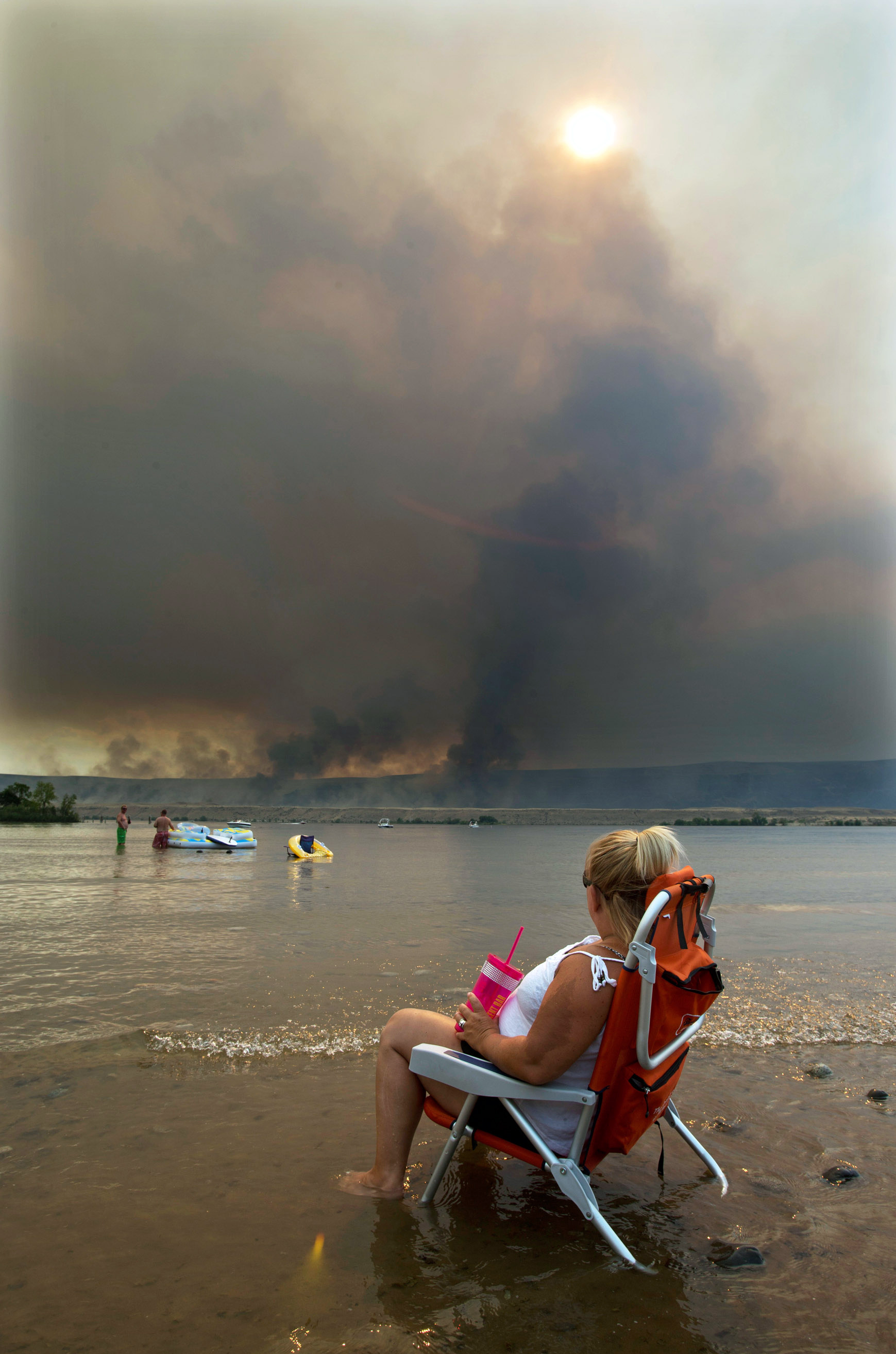 Fire officials were working on a plan to stop the fire at a ridge north of the Wild Horse wind farm, which was about 8 miles from the flames Monday afternoon. Fire spokeswoman Karen Ripley estimated the fire was at least two days away from that point.