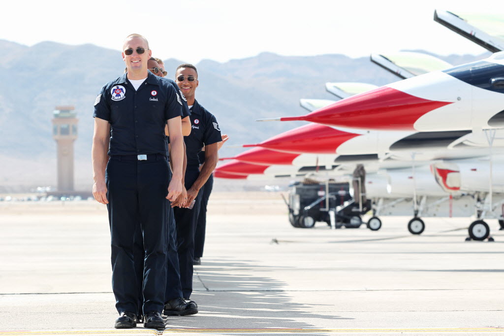 Flight crews line up to greet pilots as the Thunderbirds resume limited flight operations at Nellis Air Force Base Tuesday. The aerobatic display team was ordered to stand down April 1st because of sequestration. Enough money was found to enable the pilots to have two flights per week to maintain their qualifications. (AP Photo/Las Vegas Sun, Sam Morris)