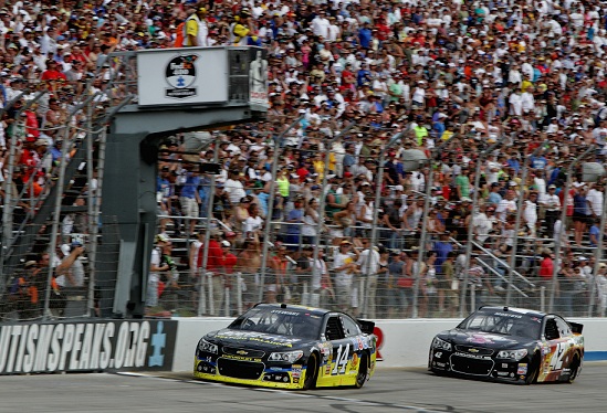 Just as a Johnson victory was looking academic, however, Denny Hamlin’s right front tire blew in Turn 1 and sent his No. 11 Toyota hard into the outside wall, bringing out the seventh caution of the race. Montoya took two tires when the lead-lap cars came to pit road and narrowly beat Johnson to the exit