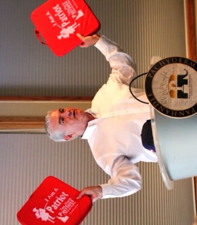 North Idaho College Trustee Ron Nilson distributes stadium cushions bearing the Tea Party logo free to anyone who attended the Panhandle Pachyderm Club meeting in Post Falls Friday. (Photo: Duane Rasmussen)