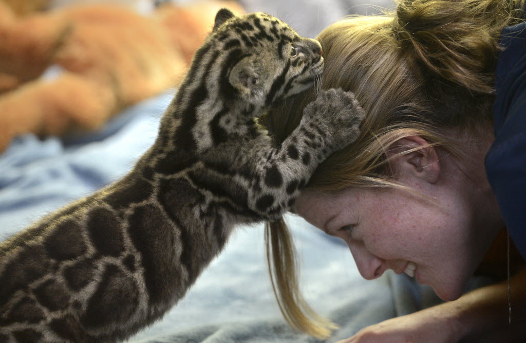 Point Defiance Zoo and Aquarium staff biologist Kadie Burrone offers her head as a climbing toy for an endangered clouded leopard cub, Tien, during his afternoon feeding time in Tacoma, Wash., on Monday. The 4.6 pound cub, born May 1, can be viewed during feedings at daily in the zoo’s Cub Den. (AP Photo/The News Tribune,Janet Jensen )