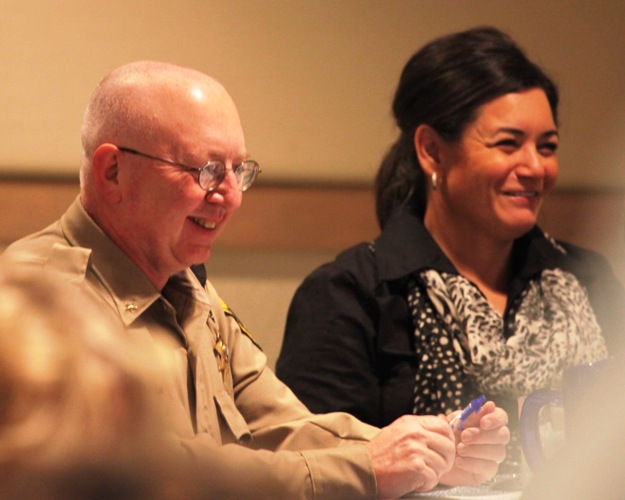 Sheriff Ben Wolfinger and Coeur d’Alene School Board candidate Christa Hazel enjoy a laugh during the local Republican women’s luncheon Thursday. Others at the table included Councilman Dan Gookin, Ruthie Johnson, Deputy County Treasurer Laurie Thomas and Duane Rasmussen. Duane snapped this photo for Huckleberries Online.