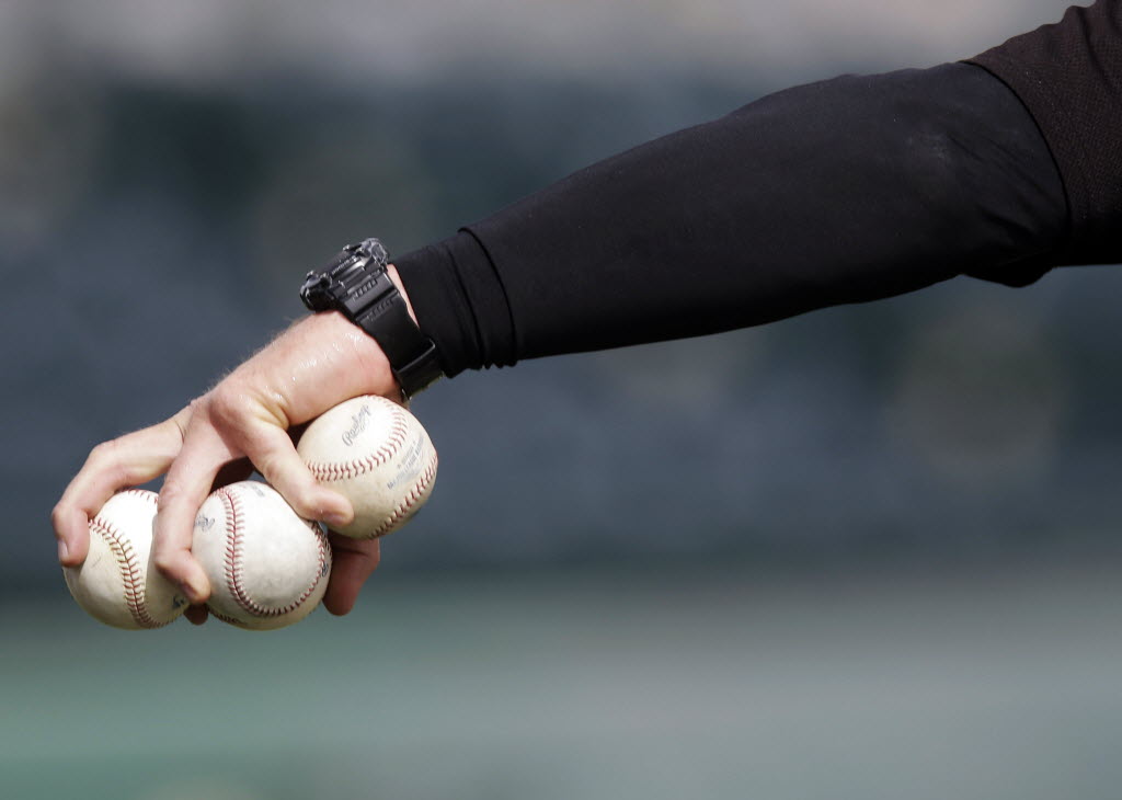 San Francisco Giants coach Russ Morman holds baseballs during batting practice before an exhibition spring training baseball game against the Milwaukee Brewers on Wednesday in Scottsdale, Ariz. You write the cutline. (AP Photo/Marcio Jose Sanchez)