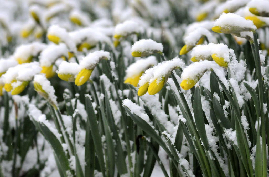 Daffodils are covered with wet spring snow in Lancaster, Pa., Monday morning as a storm stretching from the Midwest to the East Coast is burying thoughts of springtime weather under a blanket of heavy wet snow and slush. (AP Photo, Intelligencer Journal / Lancaster New Era, Richard Hertzler)