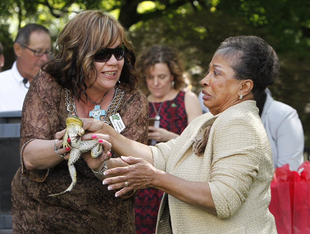Assemblywoman Cheryl Brown, D-San Bernardino, right, grimaces as Laurie Giannini, Manager of the Calaveras County Fair, hands her a frog, named “Larry B” at the 39th Annual Capitol Frog Jump at the Capitol in Sacramento, Calif., Tuesday. Lawmakers and staff members participate in the annual event as a prelude to the frog jump that will be held at the Calaveras County Fair & Jumping Frog Jubilee at Angels Camp in May. You write the cutline. (AP Photo/Rich Pedroncelli)