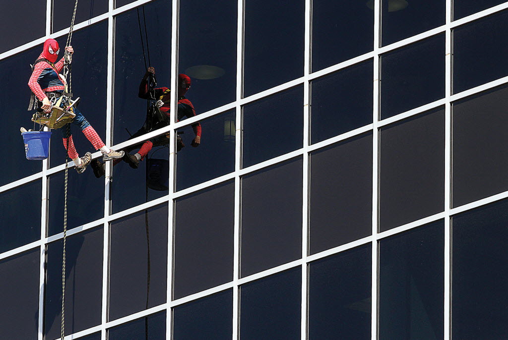 Dressed in a Spider-Man costume, Rich Shirley of Boise washes windows this morning at Kadlec Regional Medical Center in Richland, Wash. Shirley, and five other employees of Sparkling Clean Windows in Kennewick, dressed as superheroes to entertain patients and families in Kadlec’s Pediatric Center while cleaning the windows. (AP Photo/The Tri-City Herald, Richard Dickin)