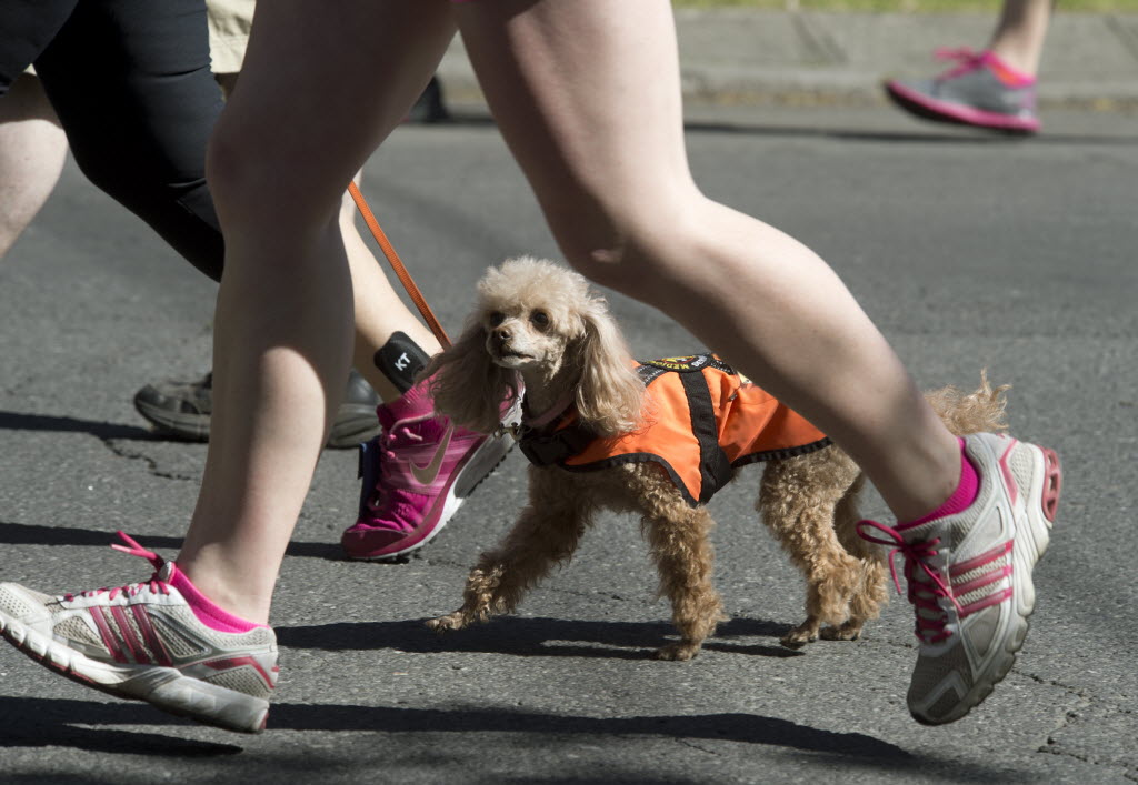 Cimon, a 9-year-old toy poddle, running with owner Diane Black of Seattle makes their way down Riverside during Bloomsday 2013 in Spokane. The dog had it’s own race number. (SR photo: Dan Pelle)